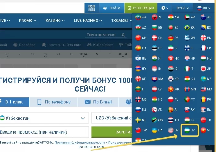 - 1xBet ni uzbekcha tilga o'zgartirmoqchi bo'lsangiz, o'zbek tilini tanlang.